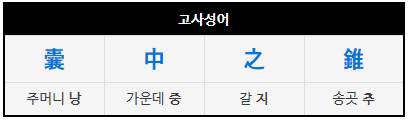 주머니의 송곳같이 날카로운 것이 있다면 아무리 주머니에 감추려고 해도 주머니를 뚫고 나온다는 의미를 가지고 있습니다. 즉, 뛰어난 사람은 감추려 해도 언젠가는 그 실력이 나오게 되어있다는 말인데요.