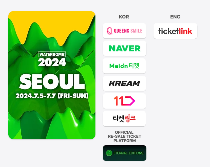 워터밤의 예매는 여러가지 사이트에서 진행할 수 있습니다. 대부분 아이디를 가지고 있는 네이버를 통해서도 쉽고 빠르게 예매를 할 수 있는데요. 가장 편한 사이트를 통해서 예매를 진행하면 됩니다.